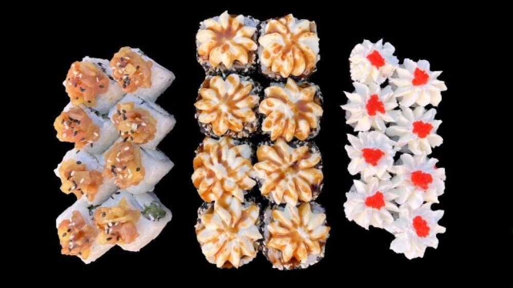 (Ролл с тар-таром, Запеченная аляска с дайконом, Сливочный лосось) 905г..